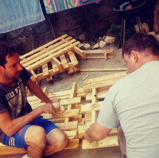An important part of this story is two of our favorite people The Urbs. They come and see us every year in our beautiful little corner of the world. The Urbs have taught me a lot about not being wasteful. They remind me of 'The Good Life' (70's TV show). When I first met these two they both had their own craft businesses using only reclaimed materials. Mrs Urb made bags and accessories from any reclaimed fabric and Mr Urb is still woodworking with reclaimed materials. Mr Urb built the frame for us from pallets, teaching the Frenchman as he went.